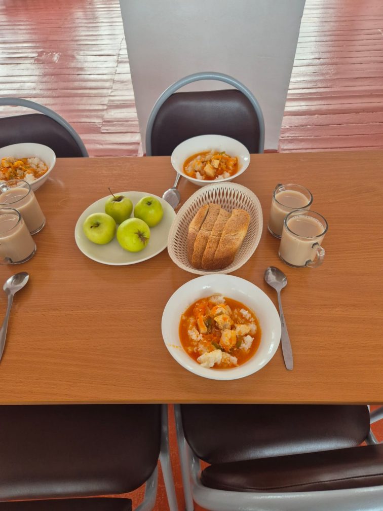 Поджарка из птицы, рис, чай с молоком, яблоко, хлеб