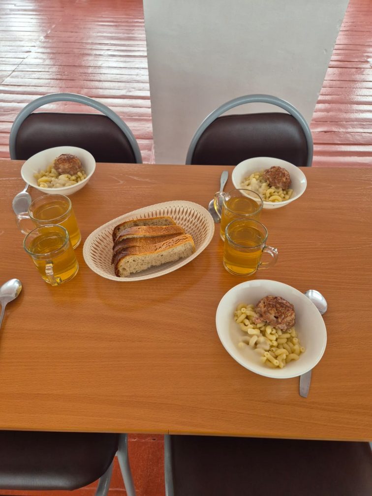 Ёжики из говядины, соус сметанный, макароны отварные, компот, хлеб