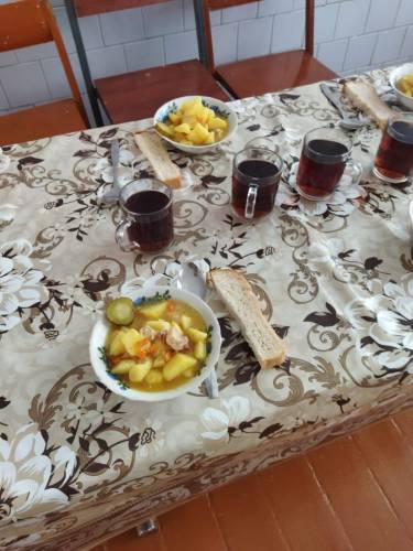 Картофель тушёный с мясом, огурец соленый, хлеб, чай